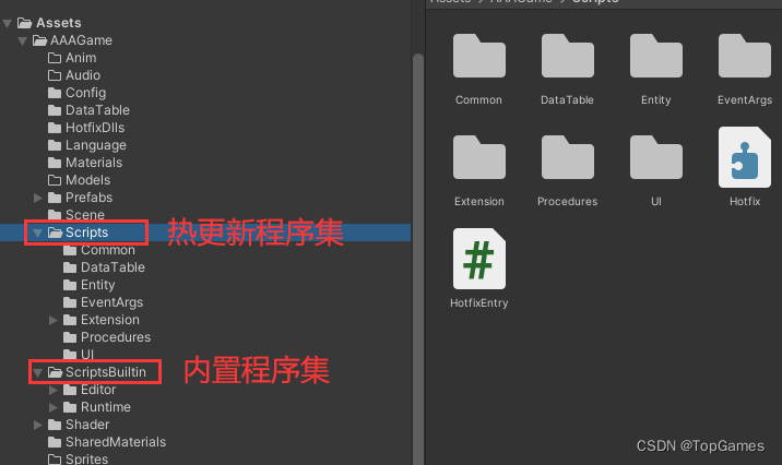 内置程序集也就是逻辑比较靠前,无法热更,必须打进包体的代码。内置程序集逻辑主要包含下载更新资源(包括热更dll资源)、调用System.Reflection.Assembly.Load(hotfixDll.bytes)载入热更dll的二进制数据,然后通过反射调用Hotfix程序集中的函数进入热更新逻辑。