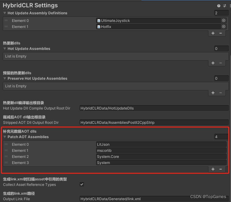 HybridCLR Settings里预留了Patch AOT Assemblies字段,用于配置AOT dll文件补充元数据。此字段HybridCLR没有用到,只是预留给用户使用的空白字段。