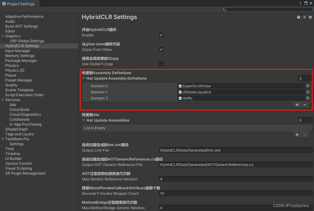 Hot Update Assemblies不需要配置,它默认返回Hot Update Assembly Definitions中配置的程序集名字列表;