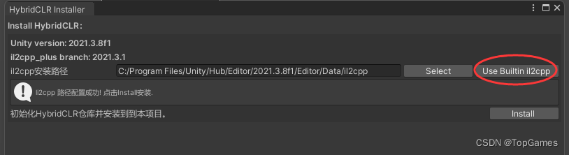 所以我以压缩包的形式内置了Unity 2021.3.1版本的il2cpp,点击Use Buitin il2cpp程序会自动解压并使用,然后点击install安装即可。(注,如果用的是Unity 2020.x,需要自行提取Unity 2020.3.33版本的il2cpp,压缩为il2cpp_Unity2020_3_33.zip放到项目的HybridCLRData目录下)