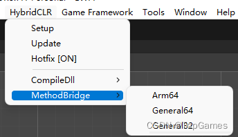 如果运行时遇到报错ExecutionEngineException: GetManaged2NativeMethodPointer not support. signature:xxx(签名),需要把手动补充到HybridCLREditorHybridCLRGeneratorsGeneratorConfig.cs中,这也是HybridCLR最大的痛点之一,好在官方刚刚完善了桥接函数的问题,后续还会完善桥接函数生成工具以彻底消除此问题。