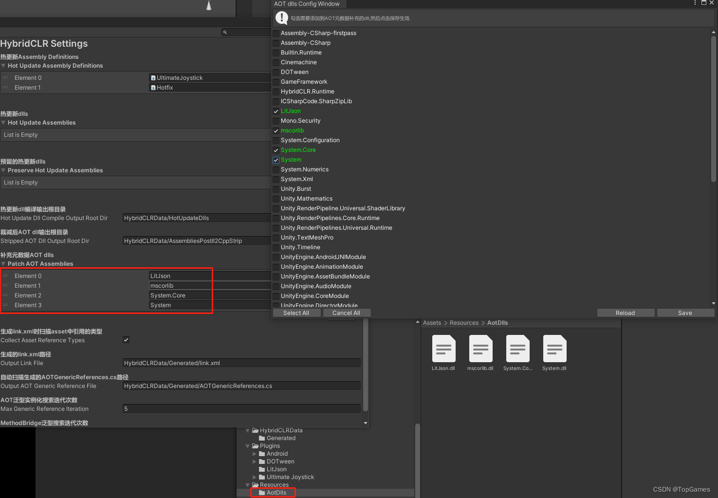 勾选AOT Dll点击Save会自动添加到Patch AOT Assemblies列表,并将对应dll文件移动到Resources/AotDlls下,然后运行时通过Resources.LoadAll<TextAsset>(“AotDlls”)加载全部AOT DLL然后调用RuntimeApi.LoadMetadataForAOTAssembly进行AOT元数据补充;