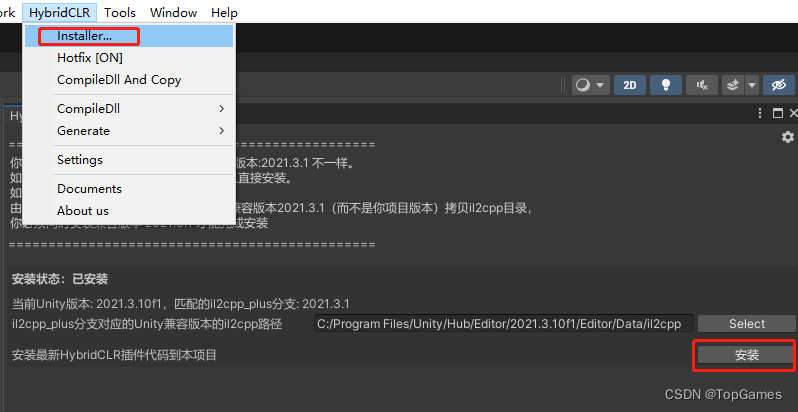 ②点击顶部菜单HybridCLR->Installer安装HybridCLR